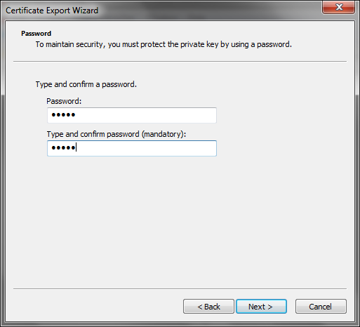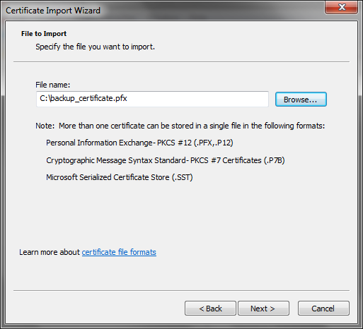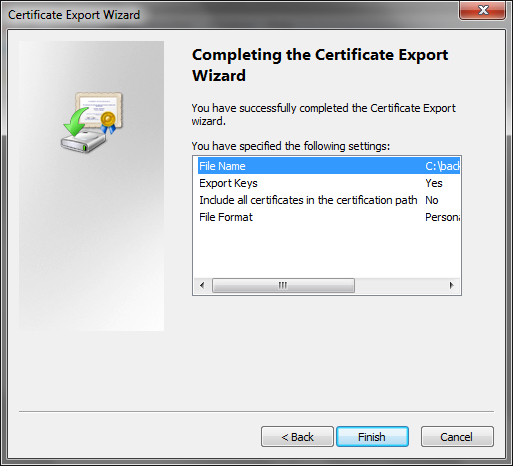 - Enter the file name and -path for the backup, with the extension .pfx.