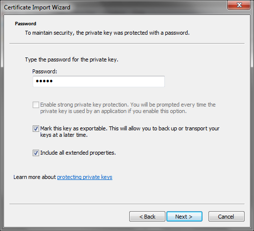 - Enter the password for the .pfx file (which was set when creating the file), select Mark the Private key as exportable and click Next: