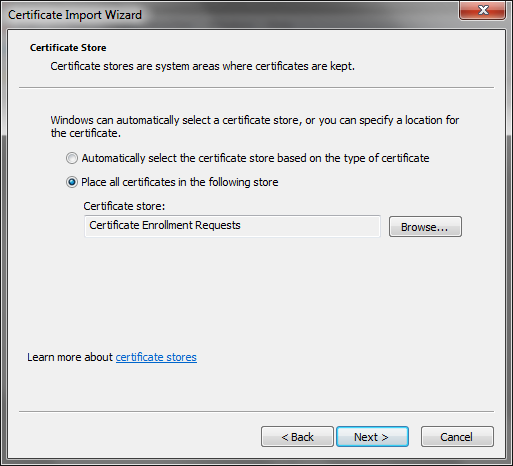- Select Place all certificates in the following store. Make sure the default certificate store is set to Certificate Enrollment Requests and click on Next.