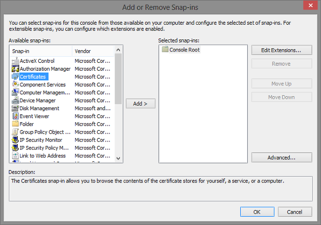 - Close the Add Standalone Snap-in box, click OK in the Add/Remove Snap-in window and go back to the MMC.