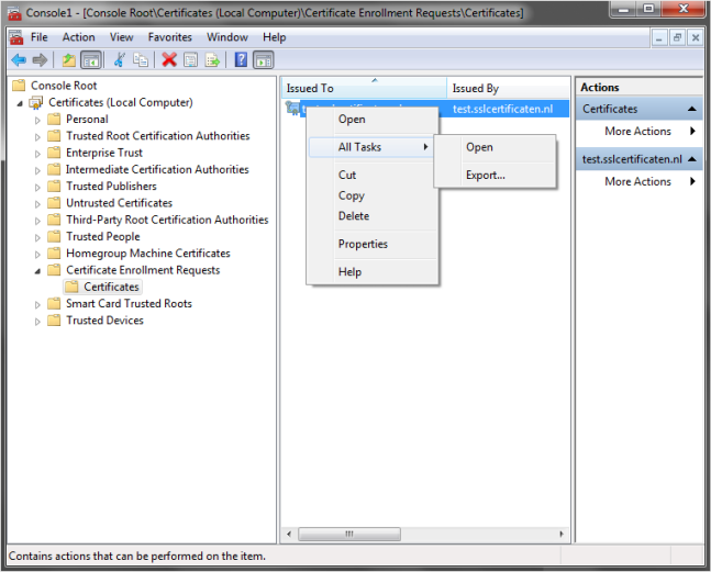 - Open the Certificates MMC Snap-in as described in the first part of this manual. Expand the tree under Certificates (Local Computer) and look for a folder named Request or Certificate Enrolment Requests. In this folder there is a sub-folder named Certificates.