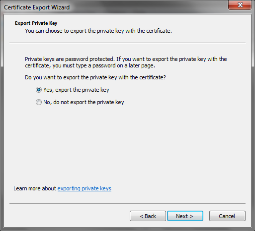 - Right-click the key, click All Tasks, and then Export... to start the Certificate Export Wizard: