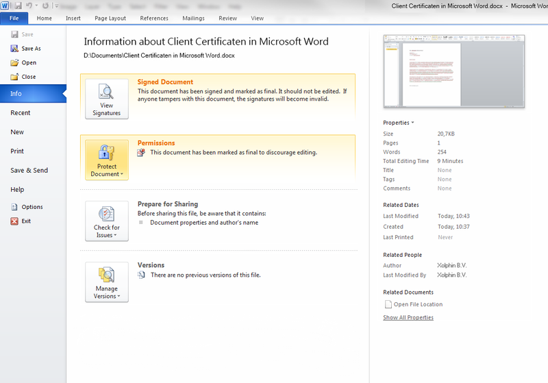 - In the Info screen you will now see highlighted in yellow that the document has been signed, and by whom.